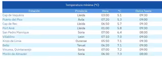 Cap de Vaquèira (Lleida) lidera la lista con una mínima de 5,1 grados, seguida de Puerto del Pico (Ávila), con 5,3; Cap de Rec y Port Ainé (Lleida), con 5,7 y 5,8 grados, respectivamente, y San Pedro Manrique (Soria), con 6,4 grados.