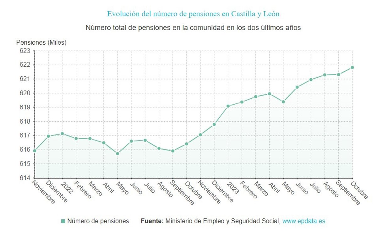 Gráfico de elaboración propia sobre la evolución de las pensiones en CyL hasta octubre de 2023 - EPDATA
