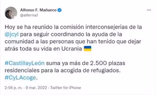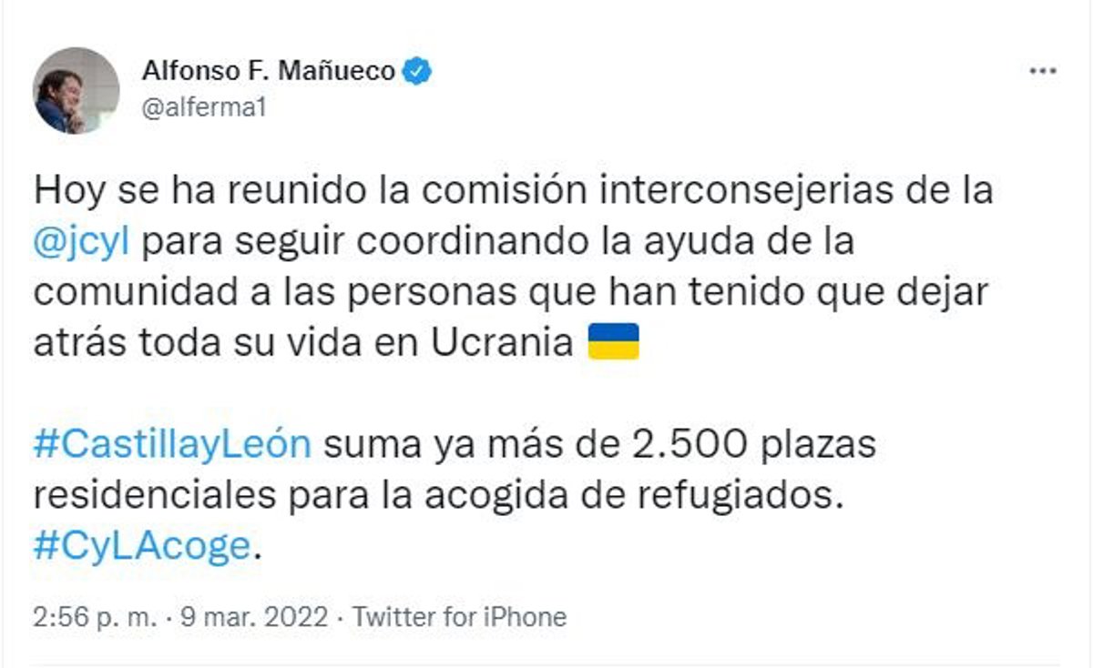 Fernández Mañueco ha publicado su tuit después de que este miércoles se haya reunido la comisión interconsejerias del Ejecutivo autonómico para seguir coordinando la ayuda de la Comunidad a los desplazados por el la invasión rusa de Ucrania.