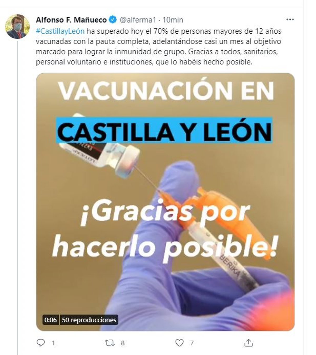 A través de su cuenta personal de Twitter, Fernández Mañueco ha escrito: "Castilla y León ha superado hoy el 70 por ciento de personas mayores de 12 años vacunadas con la pauta completa, adelantándose casi un mes al objetivo marcado para lograr la inmunidad de grupo. Gracias a todos, sanitarios, personal voluntario e instituciones, que lo habéis hecho posible".