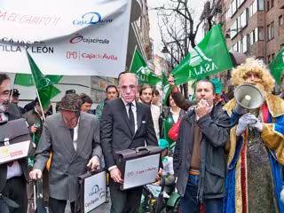 La comitiva desembocó hacia las 13.00 horas frente a las oficinas de la Federación de Cajas, donde los integrantes del colectivo depositaron carbón. Allí, el secretario general de la organización, Donaciano Dujo, voceó sus reivindicaciones acompañado de los tres Reyes Magos y agricultores ocultos tras máscaras con el rostro de los presidentes de las cajas --CajaCírculo, Caja Segovia, Caja de Burgos, Caja Duero-Caja España y Caja de Ávila--.