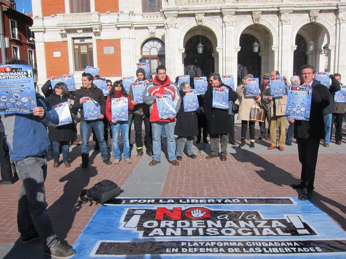 Decenas de personas convocadas por la 'Plataforma Ciudadana en defensa de las libertades' se han concentrado este sábado ante la fachada del Ayuntamiento de Valladolid para protestar contra la nueva Ordenanza por la Convivencia Ciudadana, por considerarla una norma "represora" que "criminaliza y limita derechos".