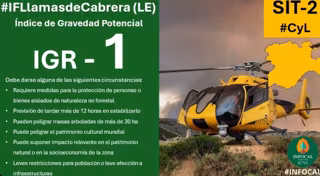 La Junta de Castilla y León ha declarado Índice de Gravedad Potencial (IGR) 1 en un incendio forestal en la localidad leonesa de Llamas de Cabrera, en la comarca de Truchas, puesto que necesita más de doce horas para ser estabilizado y en el que intervienen casi 20 medios aéreos y terrestres.