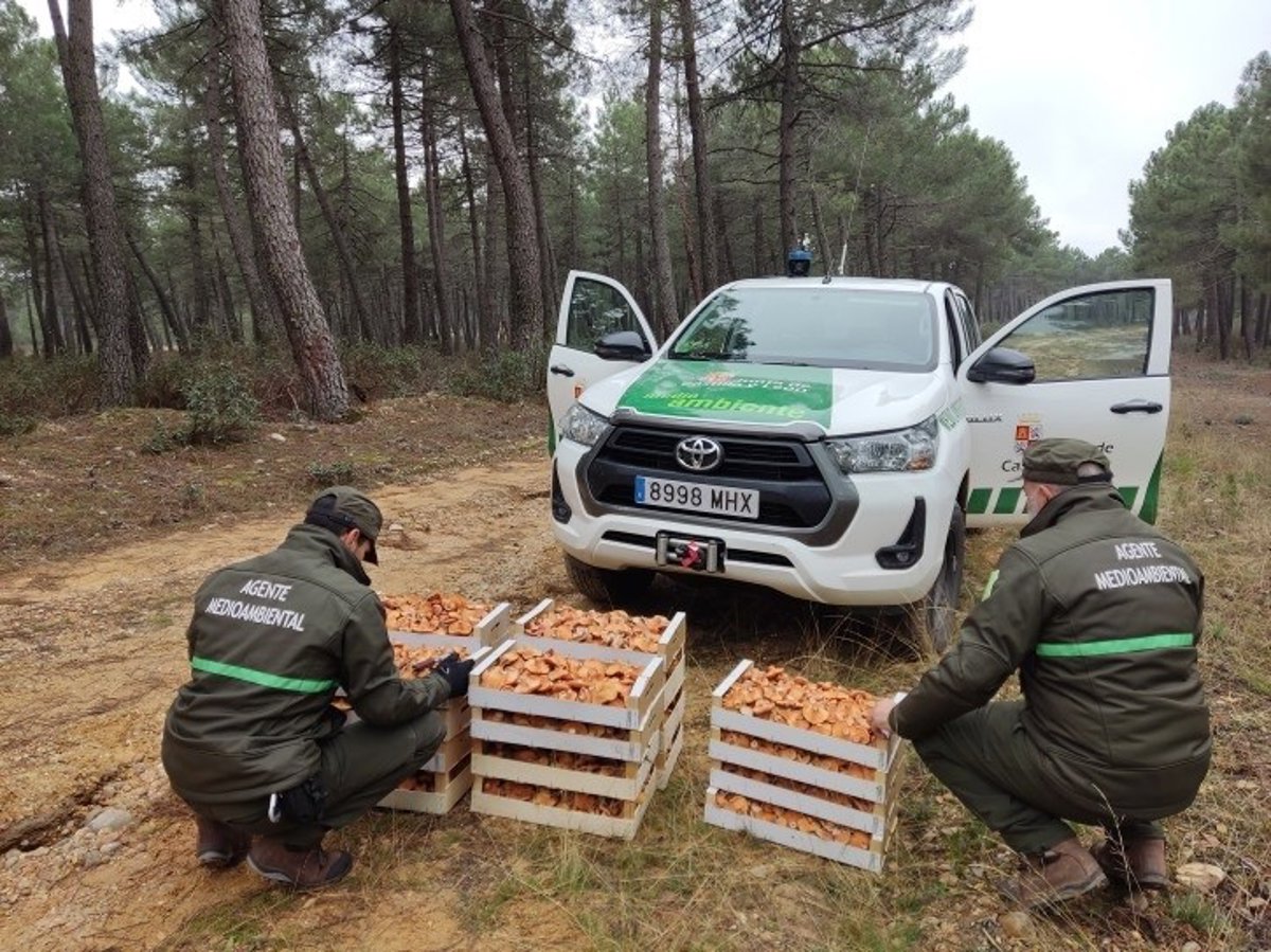 Agentes del Servicio Territorial de Medio Ambiente de la Junta de Castilla y León han decomisado 85 kilos de níscalos tras sorprender a varios recolectores ilegales en el monte de una pedanía de Santo Domingo de Silos, en la provincia de Burgos.