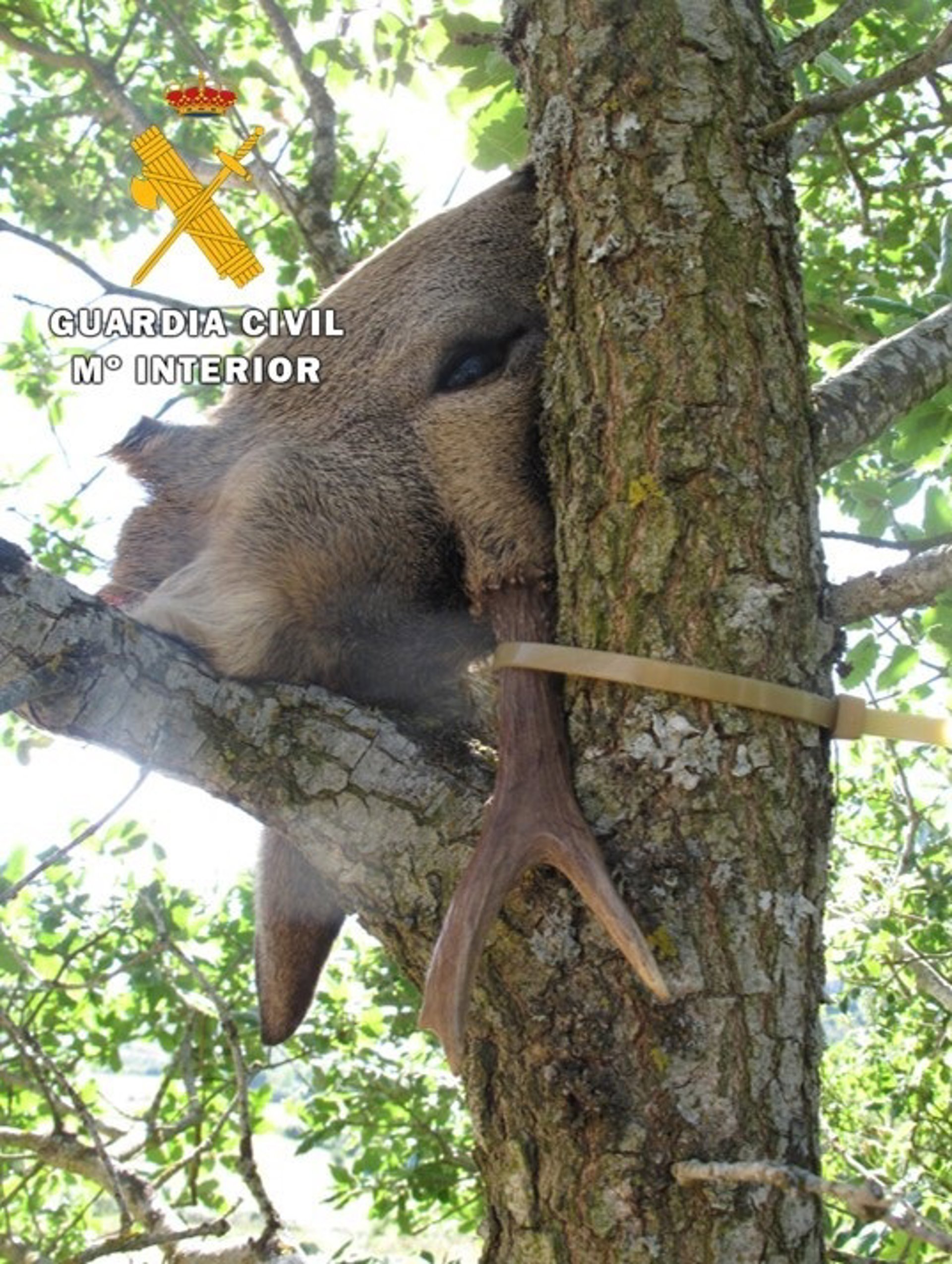 Allí localizaron entre las ramas de un roble una cabeza de corzo macho recién abatido, carente de su correspondiente precinto, sujeta con una brida de plástico al tronco, siendo ésta igual a las dos halladas entre las pertenencias de los cazadores en el coche; más tarde encontraron el cuerpo decapitado de un corzo (Capreolus capreolus).