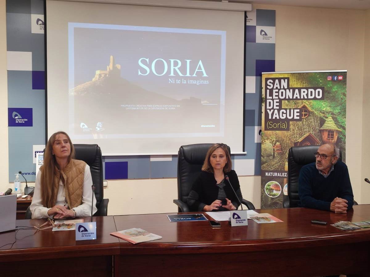 La responsable de Turismo de la Diputación Provincial de Soria, Elia Jiménez, acompañada de la presidenta de Tursoria, Beatriz Calavia, y de uno de los responsables del Bosque Mágico de San Leonardo de Yagüe, Jaime León, ha dado cuenta de las actividades que se van a realizar en la Feria Internacional de Turismo Interior, Intur, centradas en el deporte al aire libre y en el expositor de la Diputación Provincial de Soria.