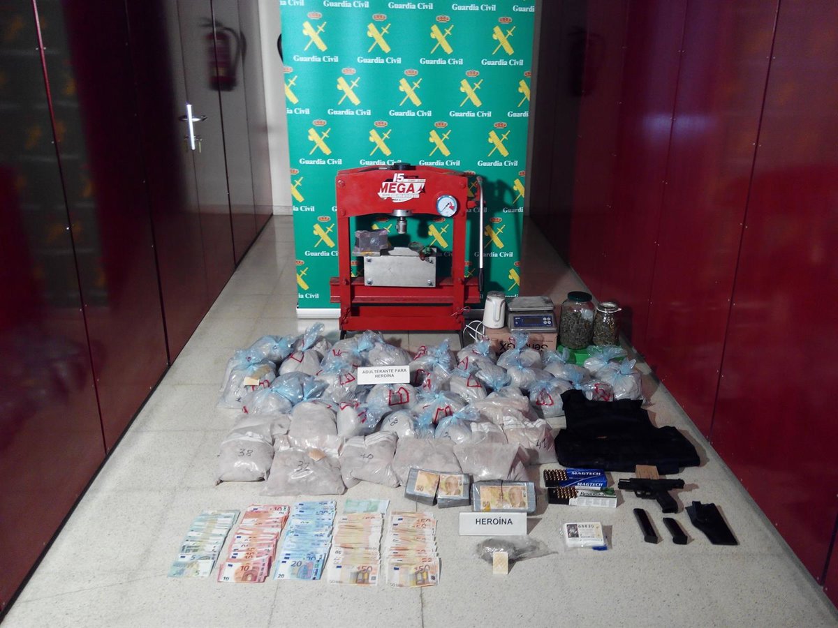 Con ocasión de los registros, la Guardia Civil incautó 84 kilogramos de sustancias adulterantes de heroína, una prensa y moldes para la elaboración de los bloques de heroína, diversos efectos y sustancias para la preparación de la droga adulterada, cuatro turismos y una furgoneta, 6.400 euros en diversos billetes de curso legal, un chaleco antibalas, una pistola y dos cajas de munición.