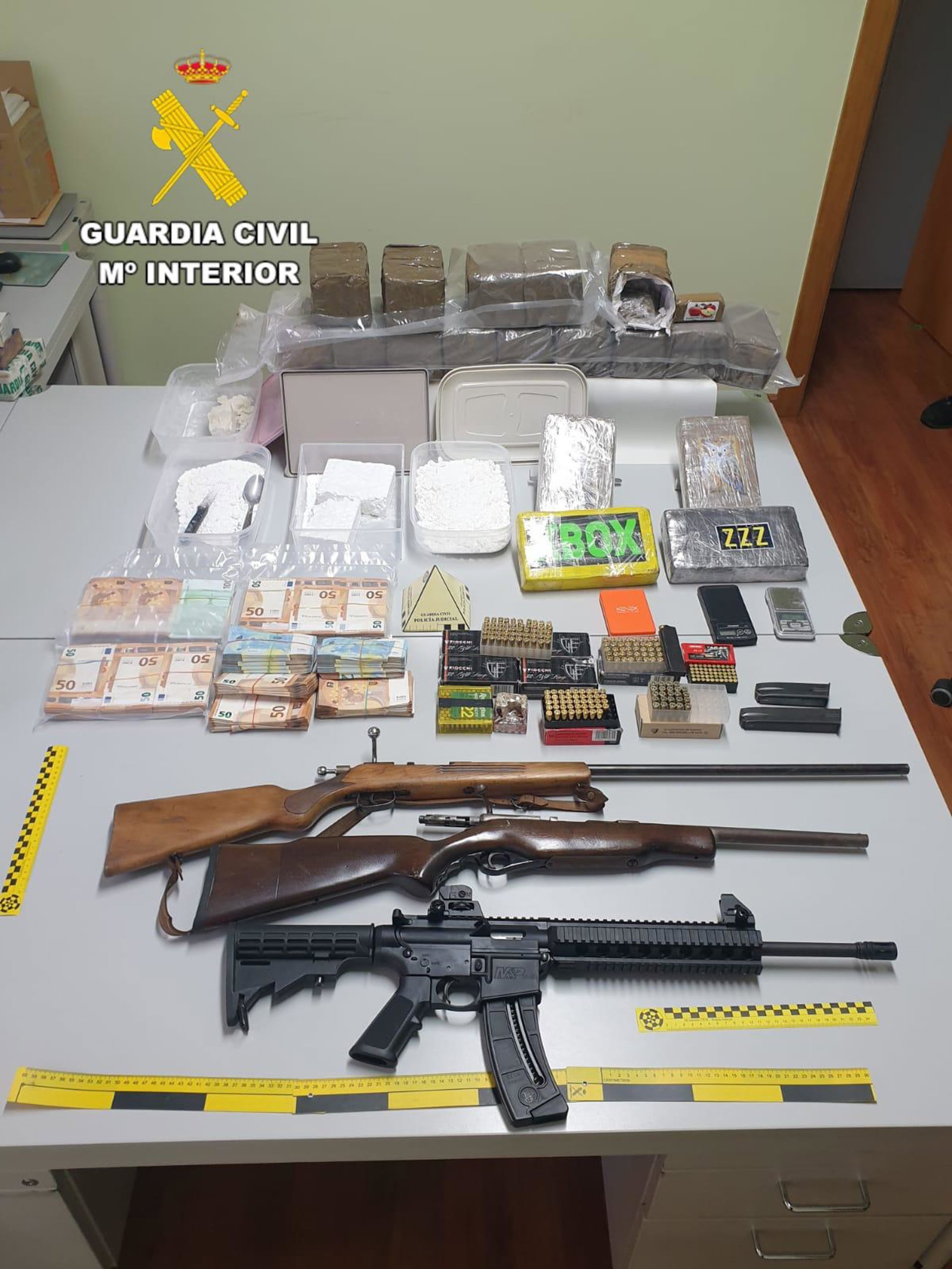 Además, se han intervenido dos vehículos, una gran suma de dinero en efectivo (cerca de 115.000 euros), teléfonos móviles, tarjetas de telefonía y varias basculas de precisión, así como tres armas de fuego, concretamente dos rifles y una carabina.