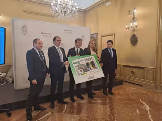 El presidente de la Diputación Provincial de Burgos, Borja Suárez, ha sido el encargado de presentar este cupón, acompañado de la presidenta del Consejo Territorial ONCE en Castilla y León, Araceli de las Heras, del delegado de ONCE en Castilla y León, Ismael Pérez, y del alcalde de Santo Domingo de Silos Emeterio Martin.
