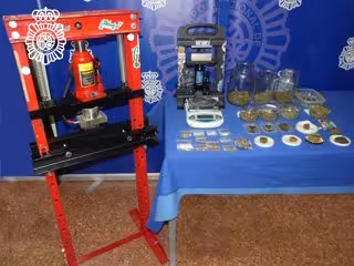 En el interior del local, vieron que había un sótano al que se accedía por unas escaleras y que contaba con varias cámaras de vigilancia instaladas, así como sistemas de extracción, dos prensas hidráulicas, diferente mobiliario, y una vitrina con cajones numerados.