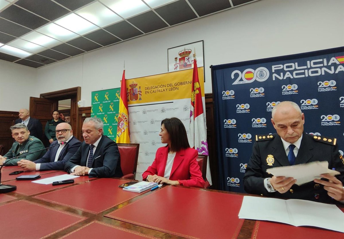 El delegado del Gobierno en Castilla y León, Nincanor Sen, acompañado por el subdelegado del Gobierno en Soria, Miguel Latorre; la subdelegada del Gobierno en Madrid, Pilar Trinidad; el teniente coronel jefe de la Comandancia de la Guardia Civil de Soria, Sergio Peñarroya, y el comisario del Cuerpo Nacional de Policía en Torrejón de Ardoz, Juan Ignacio Parreño, han presentado este miércoles en Soria la operación Titán-Rovalto.