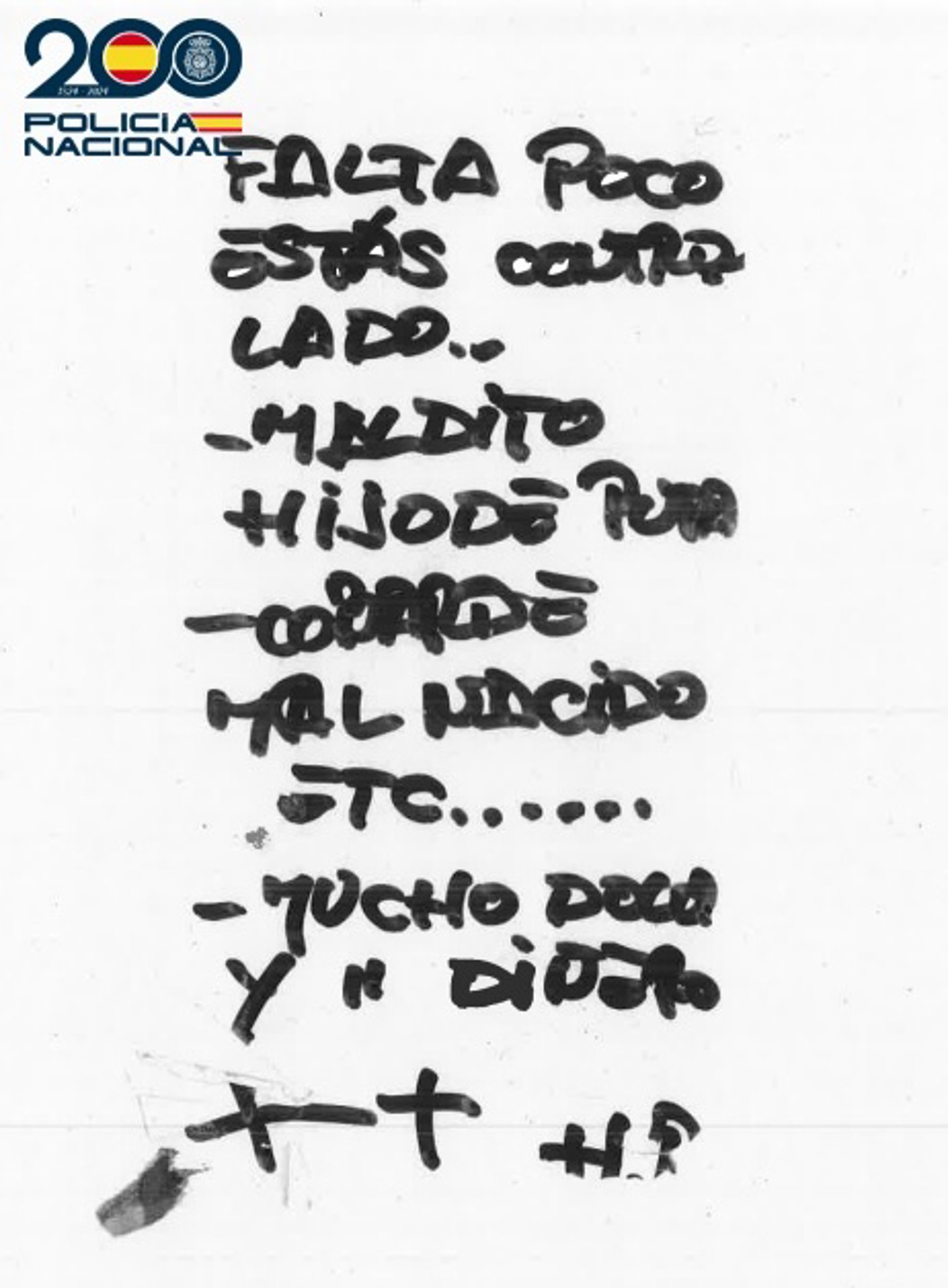 Una de las notas manuscritas amenazantes atribuidas al detenido. - POLICÍA NACIONAL