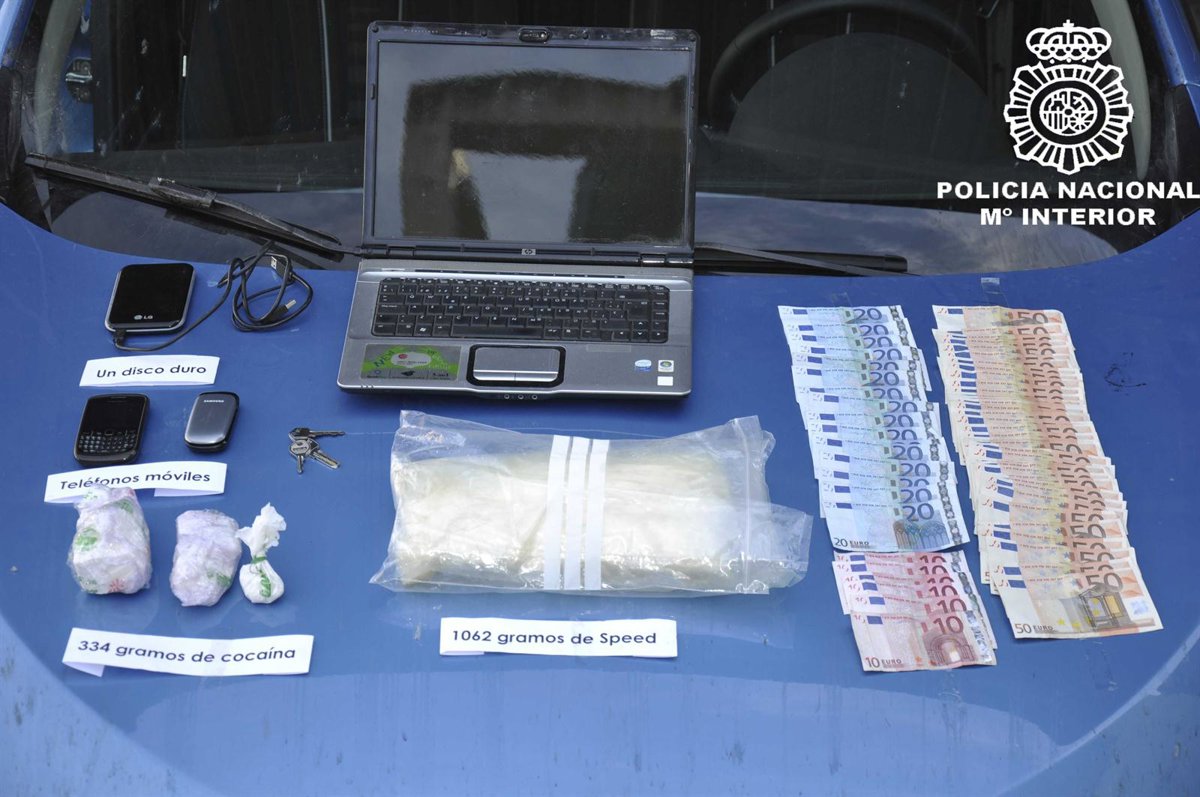 En el registro al que fue sometido, los agentes le encontraron varias bolsas de plástico con más de un kilo de speed (1.062 gramos), 334 gramos de cocaína y 2.200 euros repartidos en diferentes lugares, así como dos teléfonos móviles y un ordenador portátil con disco duro.
