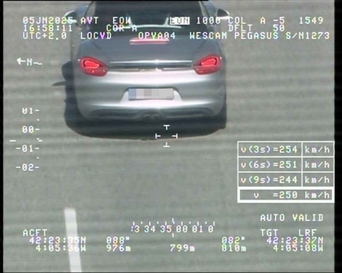 Los hechos ocurrieron el pasado viernes, 6 de junio, en el kilómetro 135 de la autovía A-231 a su paso por la comarca de Odra-Pisuerga, cuando el cinemómetro del helicóptero Pegasus captó un vehículo con placas de matrícula belga circulando a 250 kilómetros por hora, en una carretera limitada a 120 kilómetros por hora.