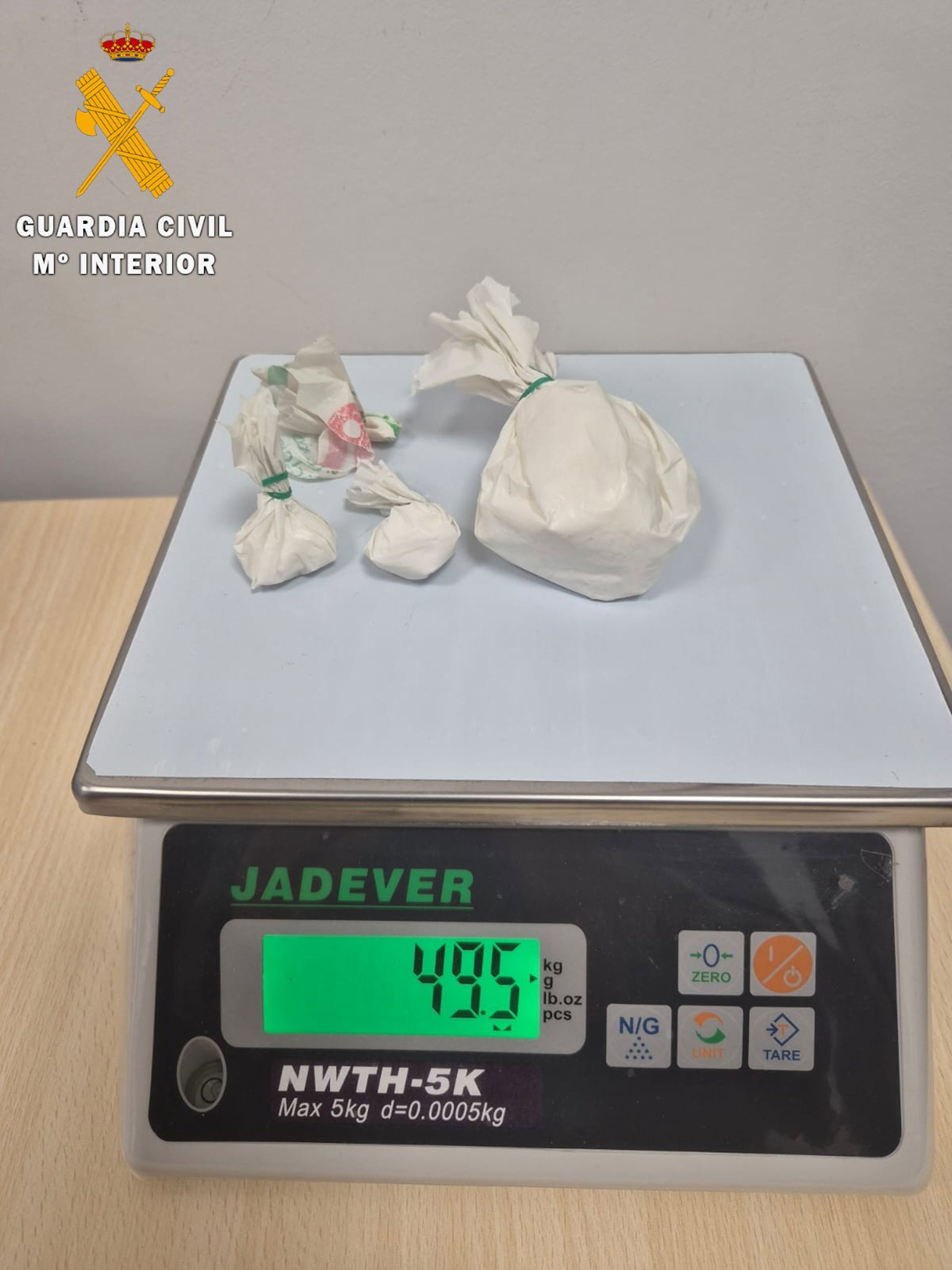 En total se incautaron 49,5 gramos de cocaína en roca y detuvo al conductor como presunto autor de un delito de tráfico de drogas, que fue puesto a disposición judicial.