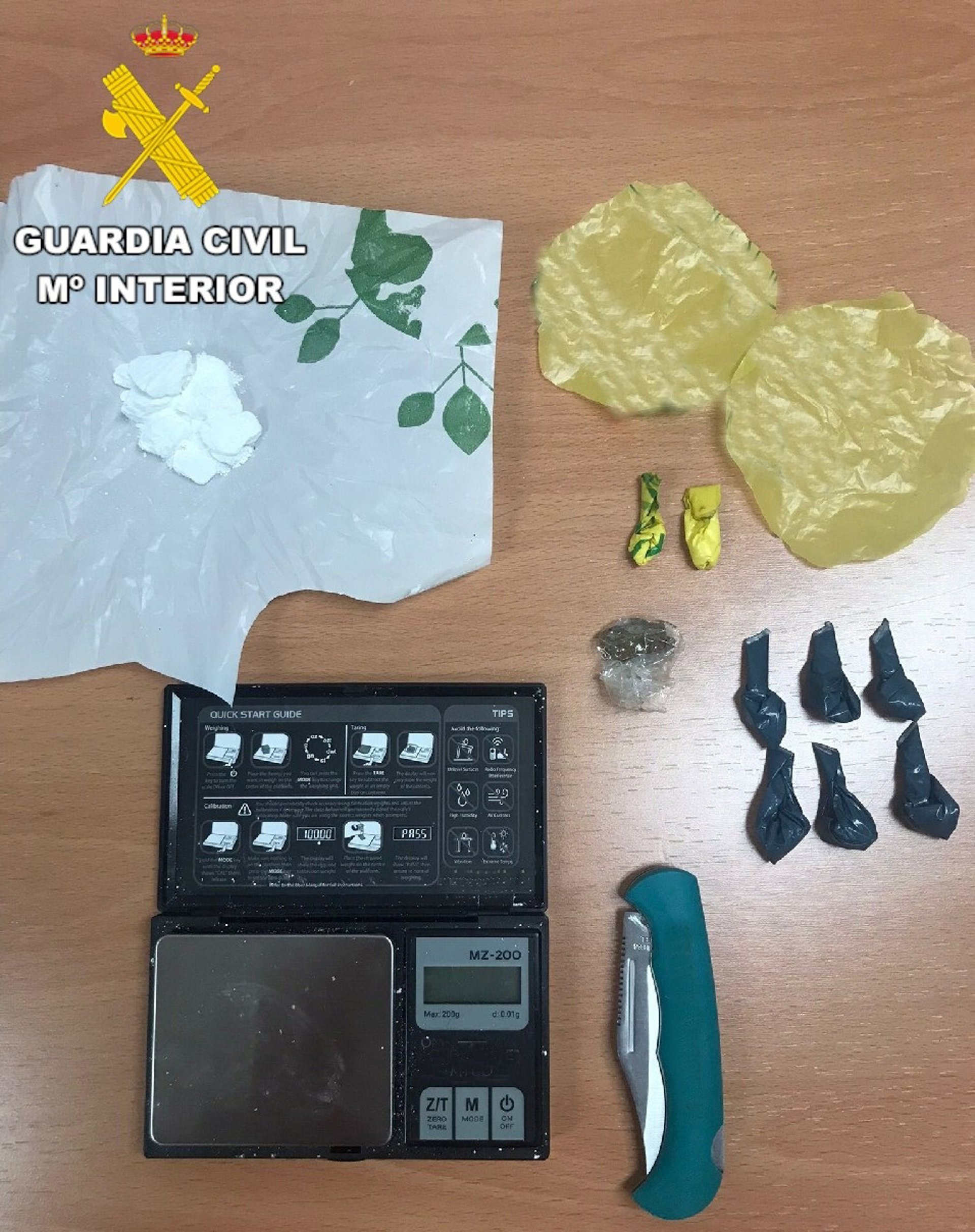 Como ha informado el Instituto Armado, en la actuación policial se le han decomisado una báscula de precisión; diez gramos de cocaína; seis gramos de metanfetamina-speed, y una pequeña cantidad de hachís, todo ello distribuido en envoltorios individuales dispuestos para su venta.