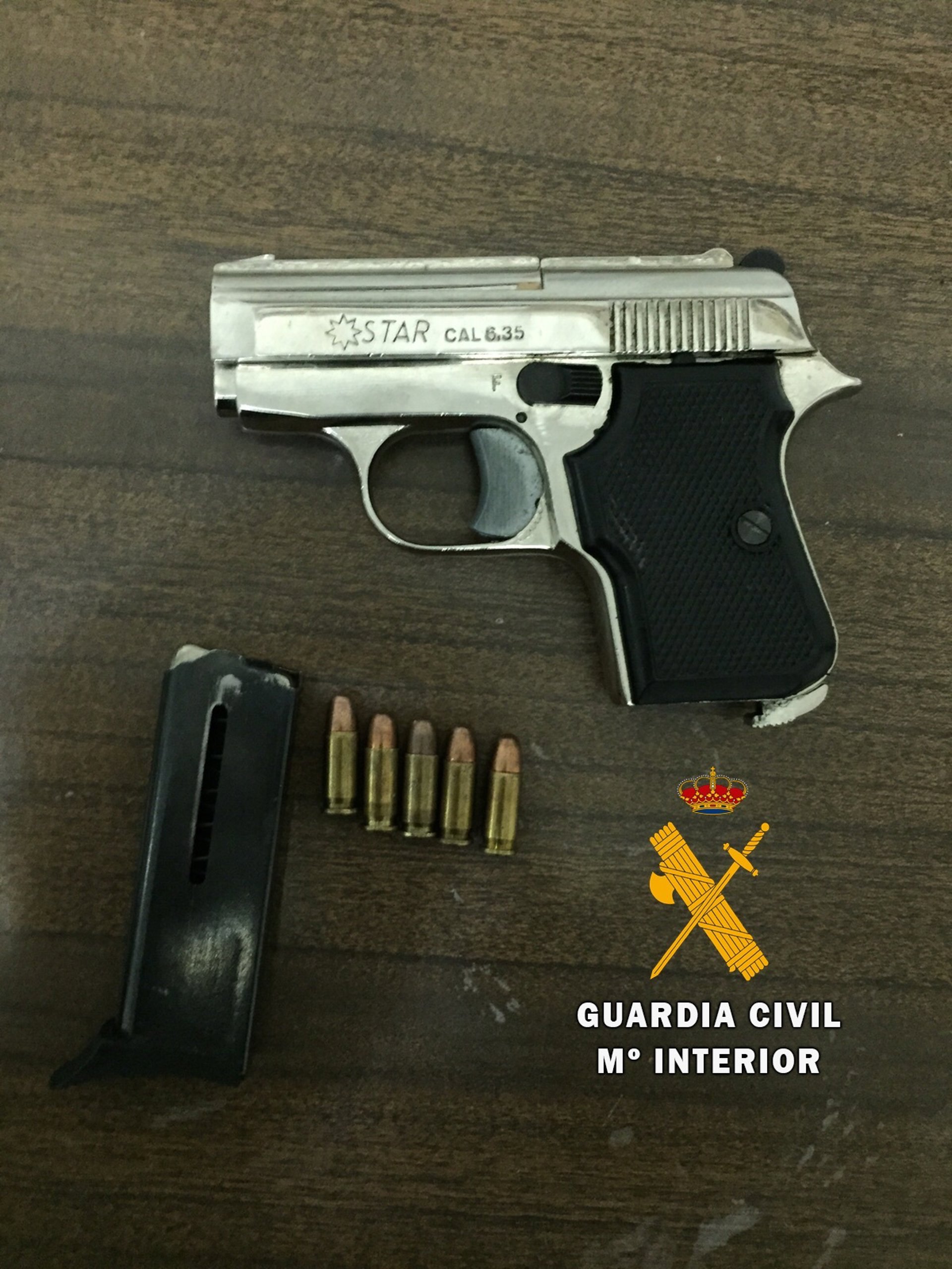 Durante la inspección, los guardias civiles descubrieron un paquete oculto, en la puerta del conductor, que tenía una pistola marca Star del calibre 6,35, junto con un cargador municionado con cinco proyectiles.