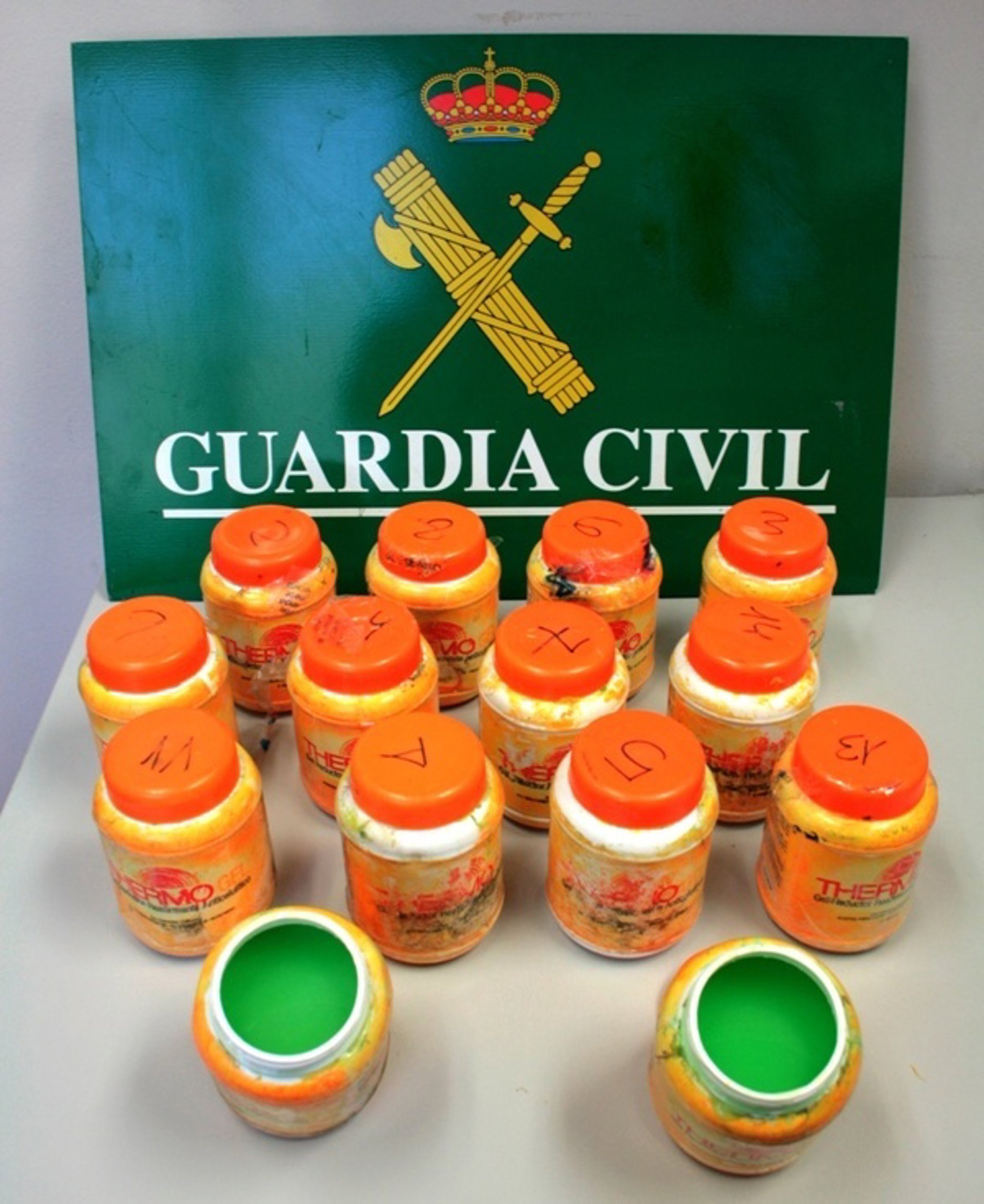 El martes, día 24, en presencia del titular y secretario del Juzgado de Instrucción correspondiente, así como del detenido y de su abogado, componentes de la Guardia Civil procedieron a la apertura del paquete postal y encontraron 14 botes de plástico que contenían una sustancia de gel reductor de color verdoso, un componente del que, tras la aplicación de varios productos químicos, se obtiene cocaína.