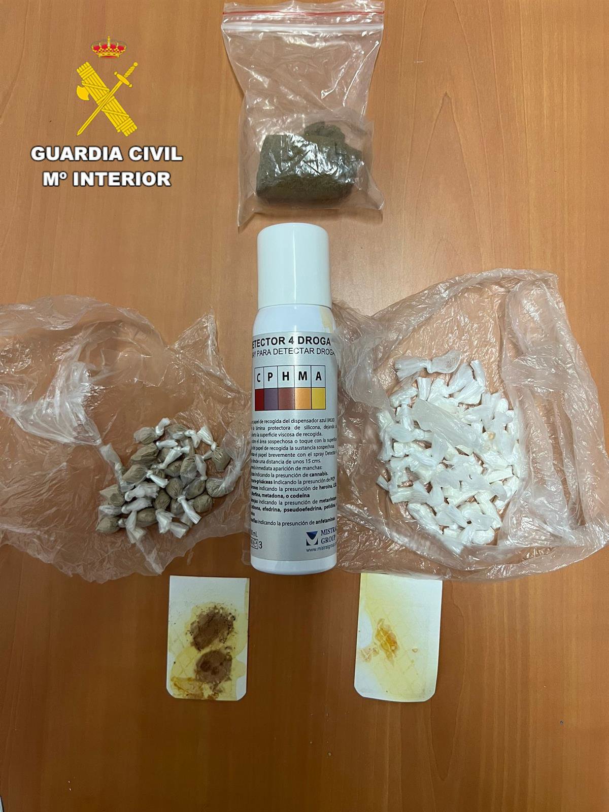 La Guardia Civil ha detenido a un joven de 27 años con 16,7 gramos de hachís, 35 dosis de MDA y 5,35 gramos de heroína, droga que ocultaba entre la ropa cuando fue sorprendido por los agentes en el área de servicio de La Pedresina de Fuentes de Oñoro (Salamanca).