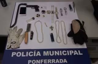 Con la ayuda de los Bomberos de Ponferrada, la Policía logró acceder al patio y detener al presunto ladrón, que solo presentaba lesiones leves en la muñeca y recuperar el botín que llevaba en una mochila, con seis relojes, tres collares, dos broches, una pistola-encendedor, un crucifijo, un teléfono móvil y los útiles empleados en el robo.