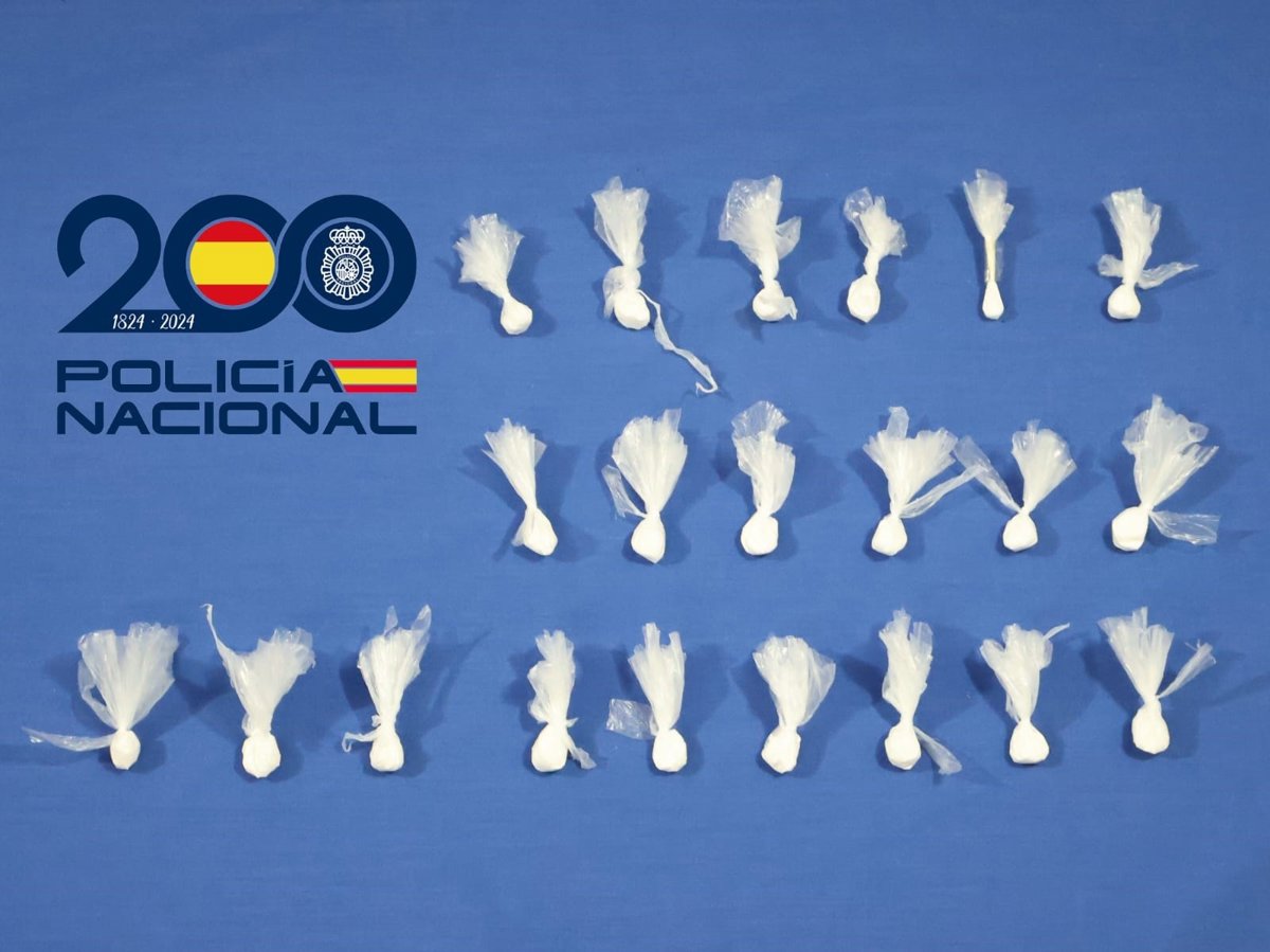 Los agentes consiguieron interceptarlo y le solicitaron la documentación para su identificación y fue durante la identificación, cuando localizaron en uno de los bolsillos de su pantalón un monedero, con 21 envoltorios de plástico que contenían una sustancia pulverulenta de color blanco, que resultó ser cocaína, y que estaba preparada para su venta.