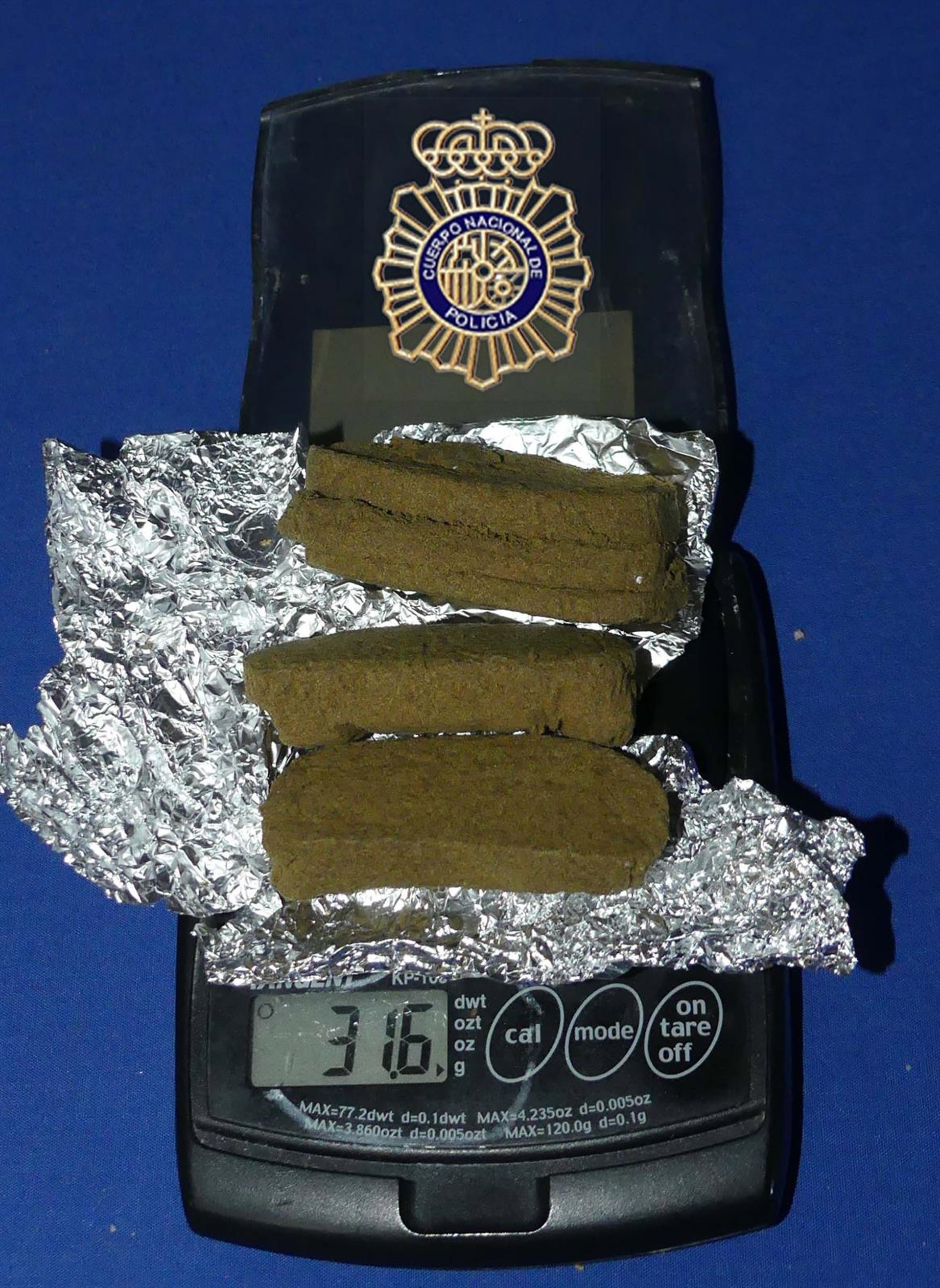 Ante esta actitud, los funcionarios le dieron el alto y procedieron a su identificación, además de descubrir que en el interior de uno de sus calcetines llevaba hachís con un peso total de 31,6 gramos y 30 euros en el bolsillo trasero del pantalón.
