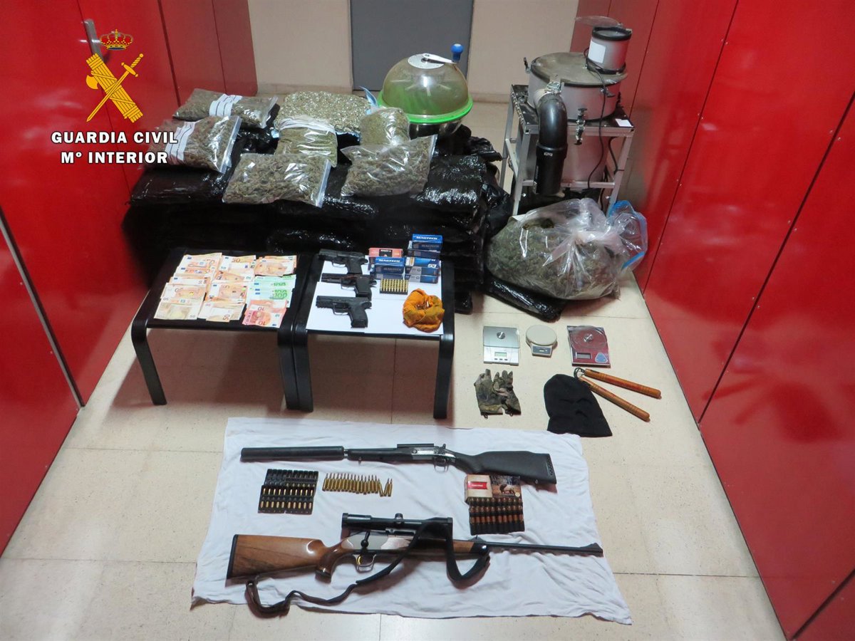 En ese momento, se incautaron 73,3 kilogramos de marihuana ya prensada y dispuesta para su consumo, 7.460 euros, dos máquinas para pelado de la planta cannabis sativa, un rifle con mira telescópica, tres pistolas calibre nueve milímetros parabellum, un rifle negro y "abundante munición para las mismas".