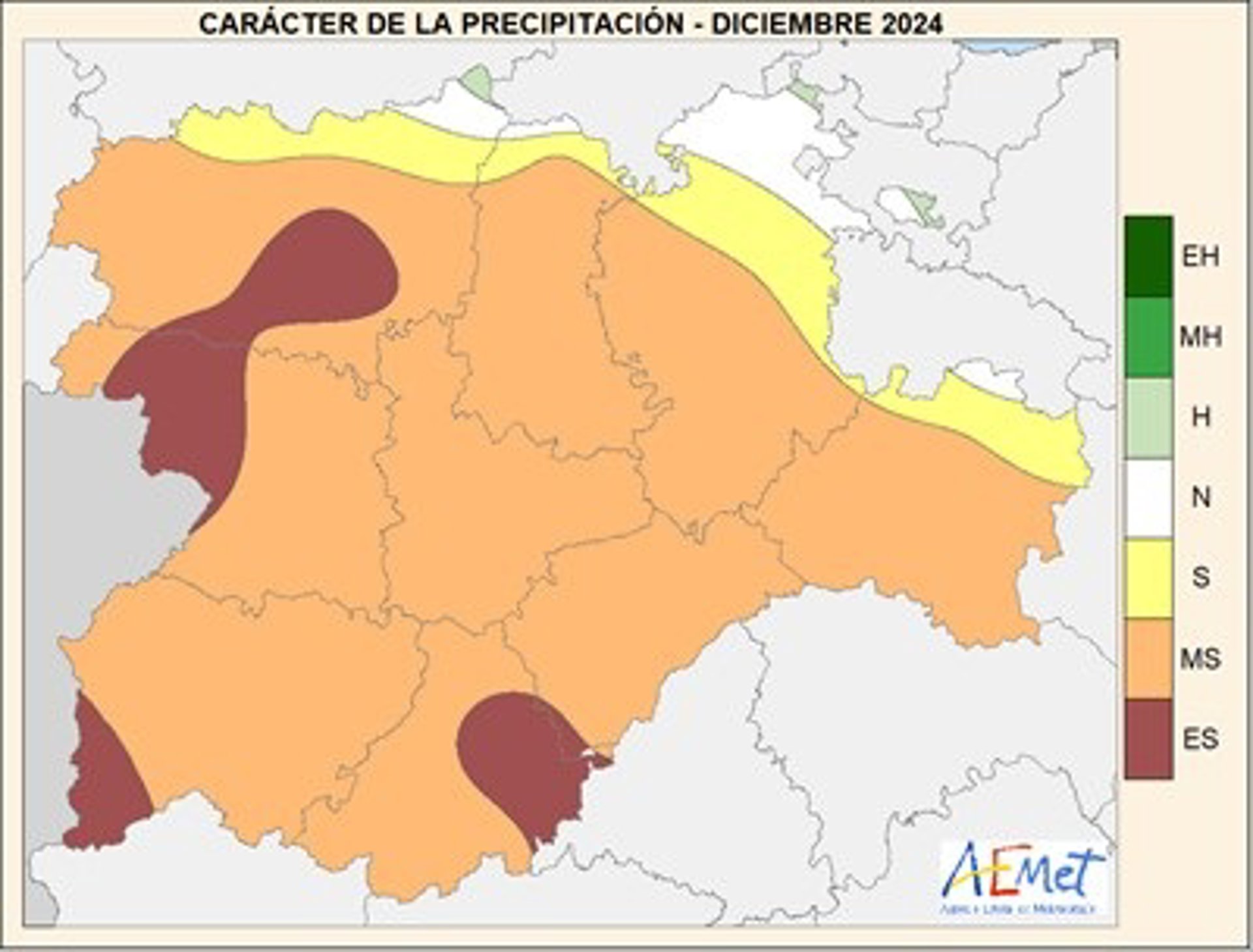 La comunidad autónoma de Castilla y León registró un mes de diciembre "muy seco" en la práctica totalidad del territorio --llegó a ser "extremadamente seco" en áreas del Oeste y del Sur y "seco" y "normal" en sus extremos Norte y Noreste-- con un déficit de precipitación acumulada del 73 por ciento respecto al promedio mensual.