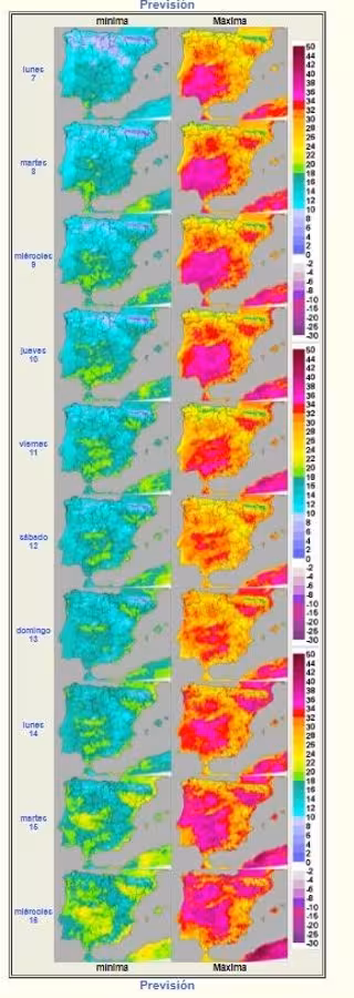 En concreto, la previsión de la Aemet contempla temperaturas máximas generalizadas por encima de los 27 grados que, localmente, llegarán a los 35. Además, sólo se esperan chubascos el viernes, día 11; el sábado, día 12, y domingo, 13 de junio.