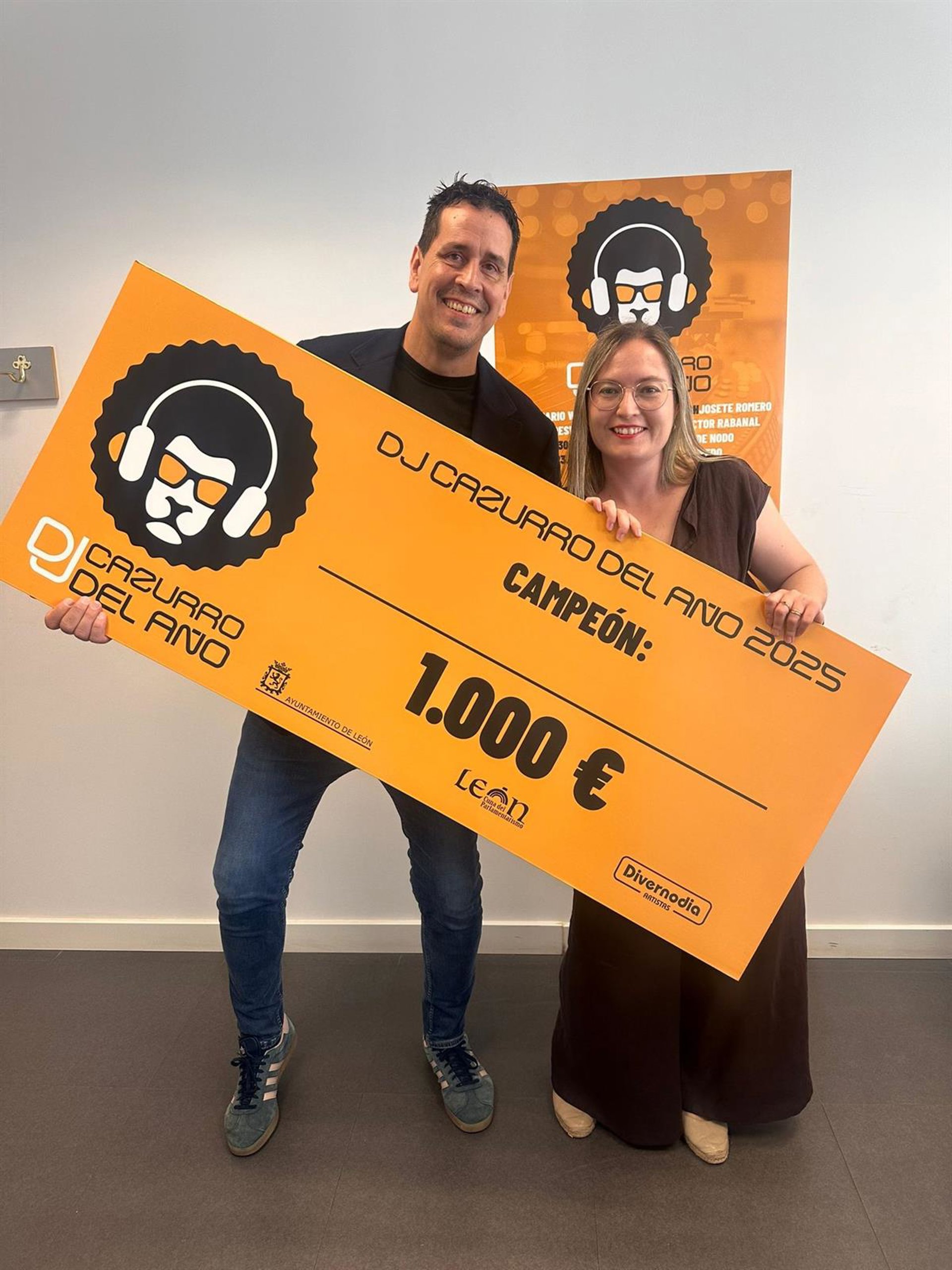 La concejala de Fiestas de León, Camino Orejas y Jesús Notario, responsable de Divernodia, como responsables de las entidades que organizan la competición 'DJ Cazurro del Año'. - AYUNTAMIENTO DE LEÓN