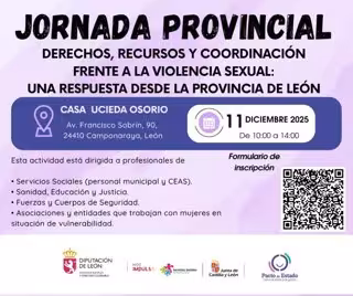 La Diputación de León, a través del Programa de Mujer, ha organizado una jornada provincial sobre derechos, recursos y coordinación frente a la violencia sexual, un espacio de trabajo conjunto cuyo objetivo es avanzar en la atención integral a las víctimas desde todos los ámbitos implicados que tendrá lugar el 11 de diciembre de 10.00 a 14.00 horas.