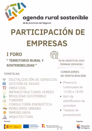 La Diputación de Segovia organiza el próximo martes, 30 de agosto, el I Foro 'Territorio y sostenibilidad' sobre agendas urbanas y rurales piloto en el medio rural en la localidad de Pedraza, en horario de 12.00 a 18.00 horas.