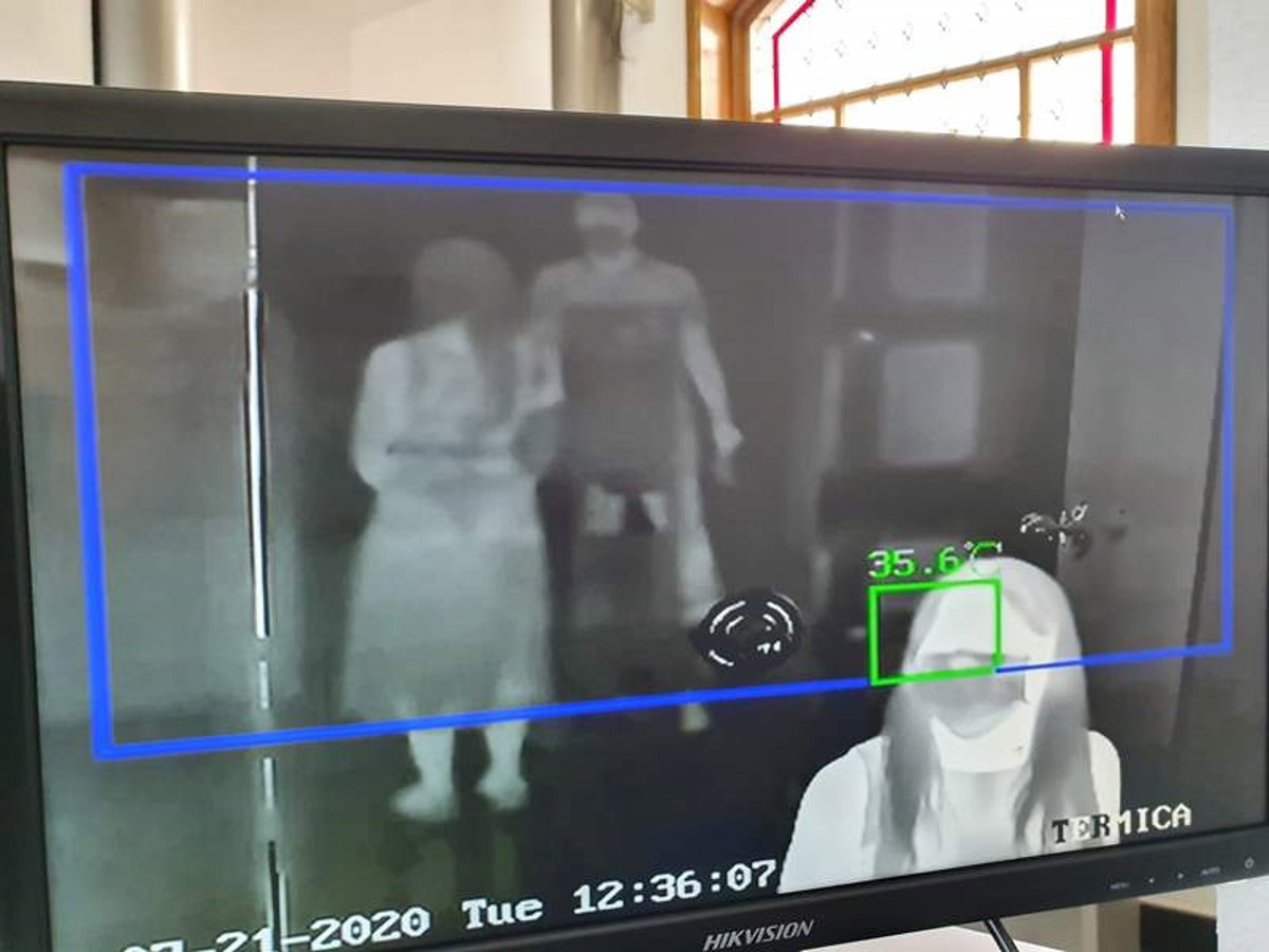 La cámara da un aviso sonoro si registra una temperatura superior a 37'8 y toma una imagen que luego se desestima, realiza de nuevo la prueba para detectar si es un falso positivo y si persiste se insta a esa persona a que vuelva a su casa y llame al Centro de Salud.