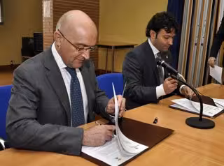 El presidente de la Diputación de Valladolid, Jesús Julio Carnero, y el alcalde de la localidad vallisoletana de Tordesillas, José Antonio González Poncela, han suscrito este martes el convenio por el que la Institución provincial colabora con el municipio para la puesta en marcha del Servicio de Respiro.