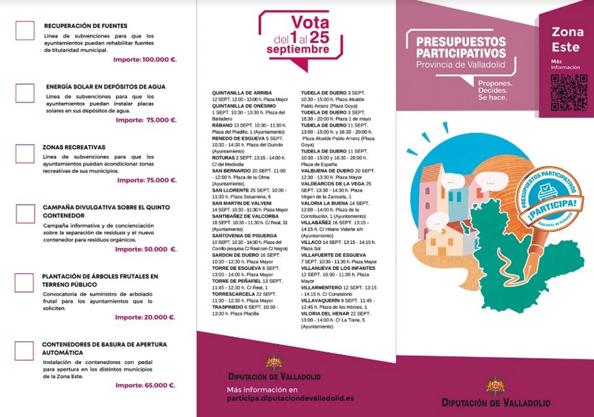 La Diputación de Valladolid ha iniciado este jueves, 1 de septiembre, el plazo de votación de las propuestas de los Presupuestos Participativos con el fin de ejecutar actuaciones por importe de 1,2 millones.