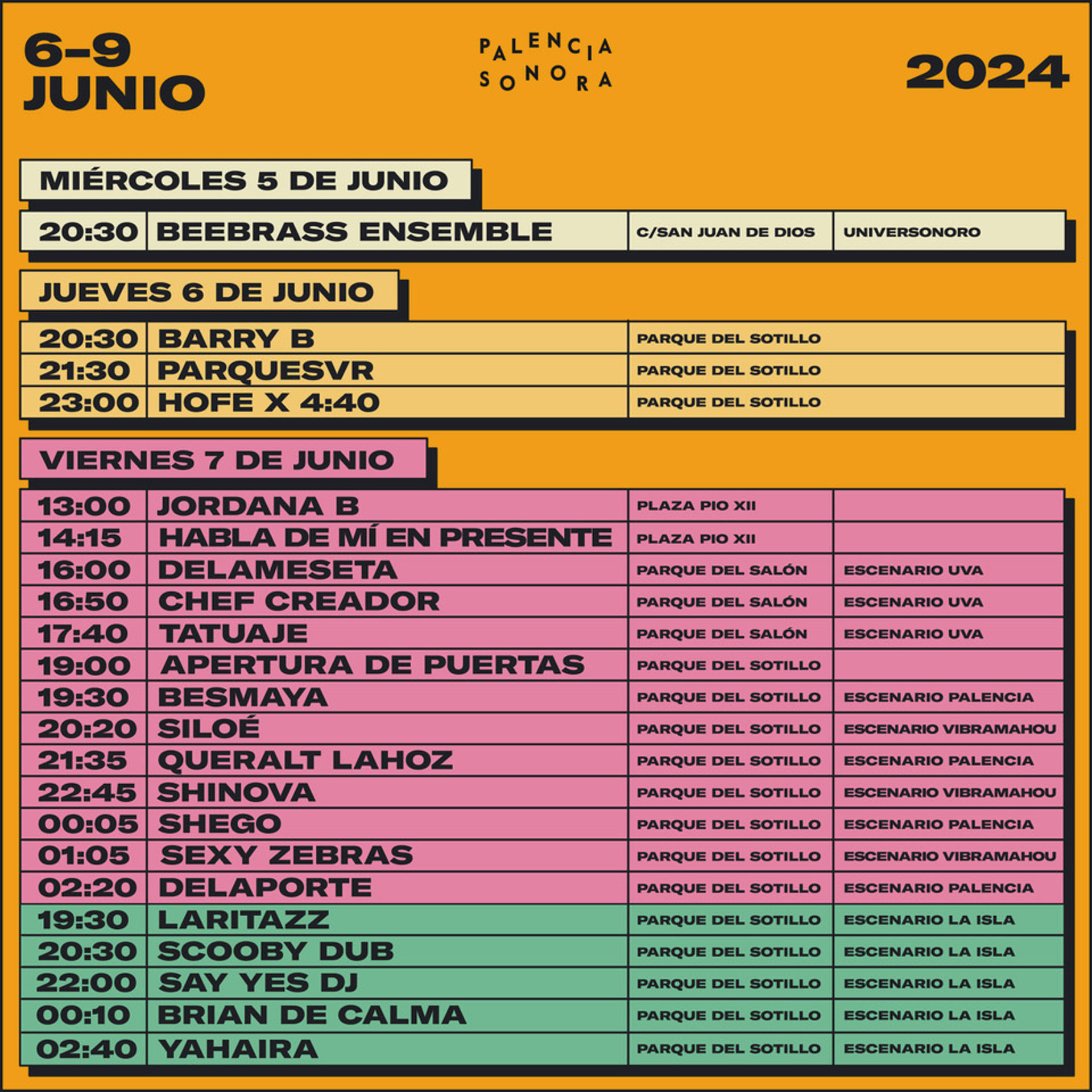 Al Escenario Vibra Mahou se subirán algunos de los nombres más vinculados al Palencia Sonora, como Rodrigo Cuevas, "el gran renovador de la tradición musical del norte de España" que presentará, a las 20.00 horas, 'Manual de romería'. Y a las 22.20 horas debutará en el festival Arde Bogotá, con dos nominaciones a los Grammy Latinos 2023, y a las 00.55 horas será el turno de 'El Columpio Asesino' como parte de su última gira, 'Amarga baja'.
