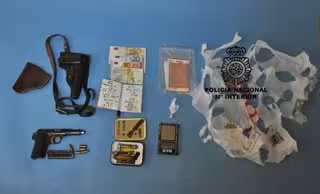 Tras las detenciones, en el registro del domicilio se han intervenido dos gramos de heroína, restos de marihuana y hachís, algunas pastillas de barbitúricos, una balanza de precisión, recortes plásticos para elaborar dosis, ciento cincuenta euros en efectivo, dos teléfonos móviles, así como una pistola con su cargador y seis cartuchos de 9 milímetros.