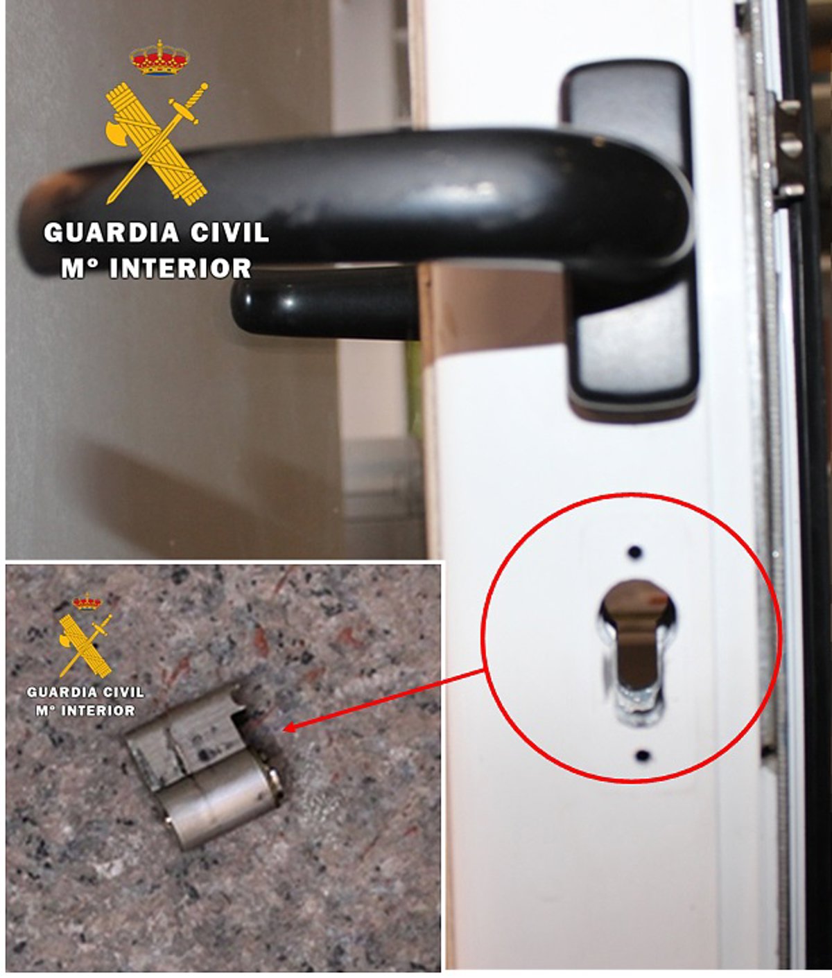 tras la inspección ocular practicada en los lugares por Fuerzas del Cuerpo, verificando que se había producido mediante una sutil fractura del bombín de la puerta de entrada.