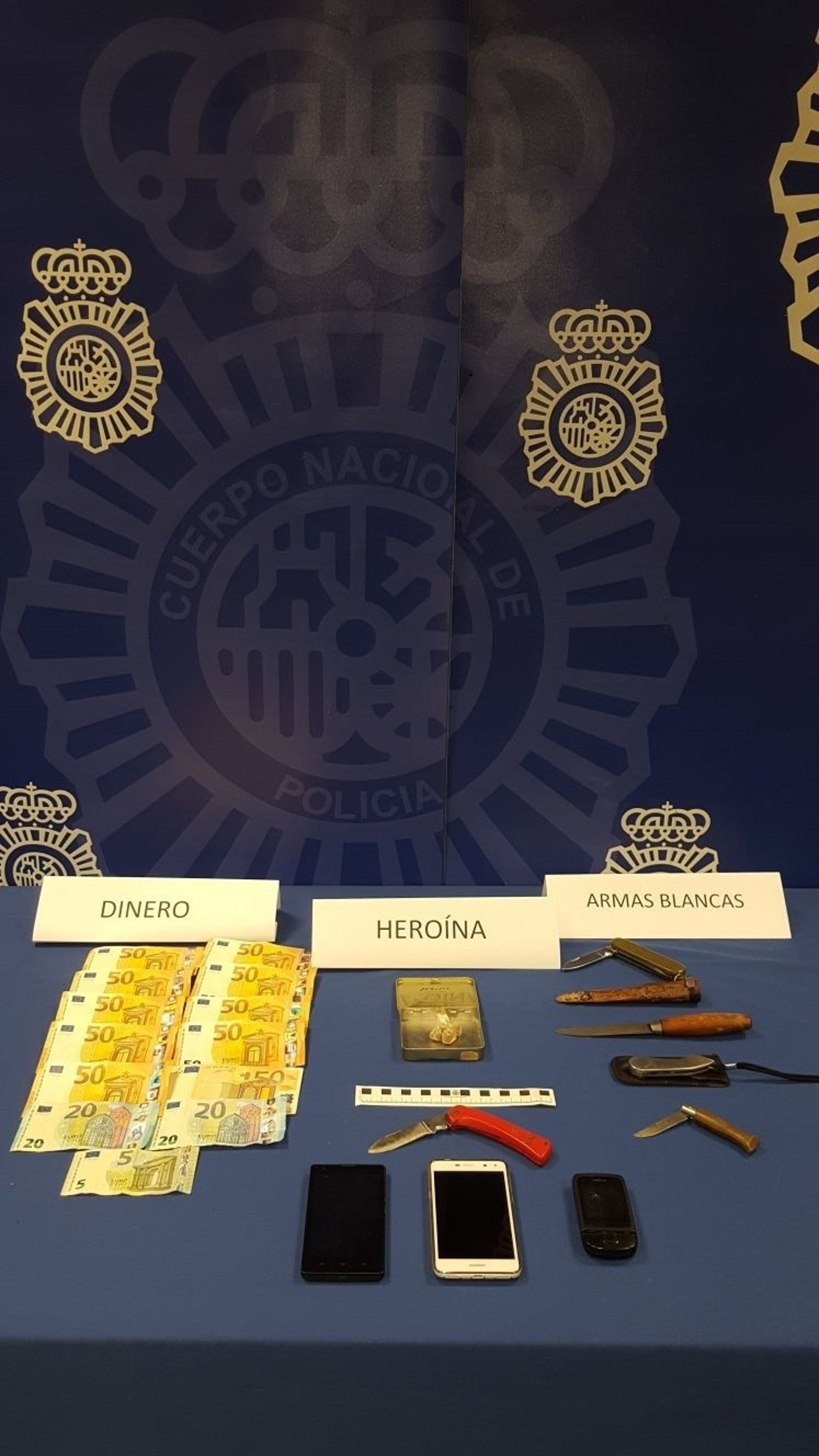 Los agentes tras contar con la autorización judicial, dentro de la 'Operación Carpanta', practicaron un registro domiciliario e intervinieron 600 euros, más de 20 dosis heroína, un vehículo y diversas armas blancas.