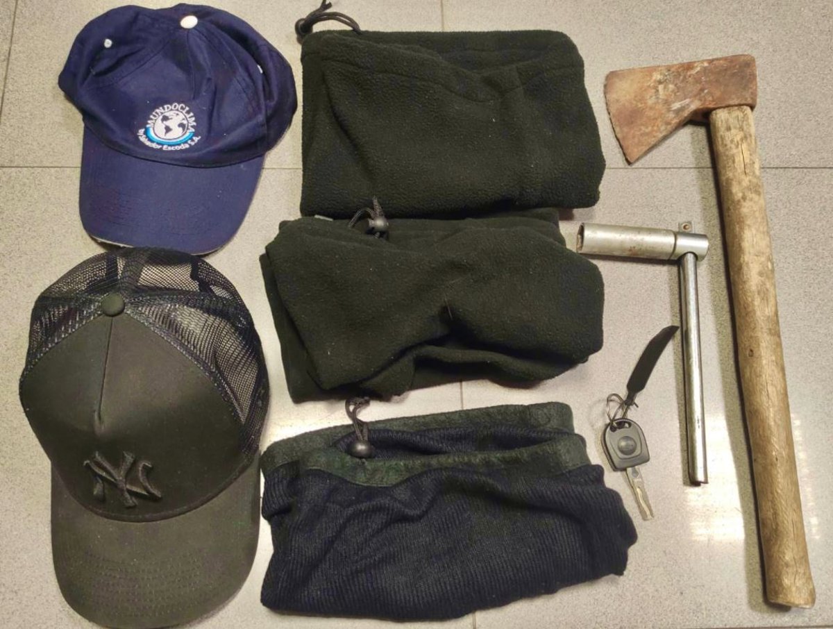 En el registro, localizaron dos gorras, cuatro bragas de cuello, una llave de coche con anagrama de Seat, un hacha y una llave de carraca.