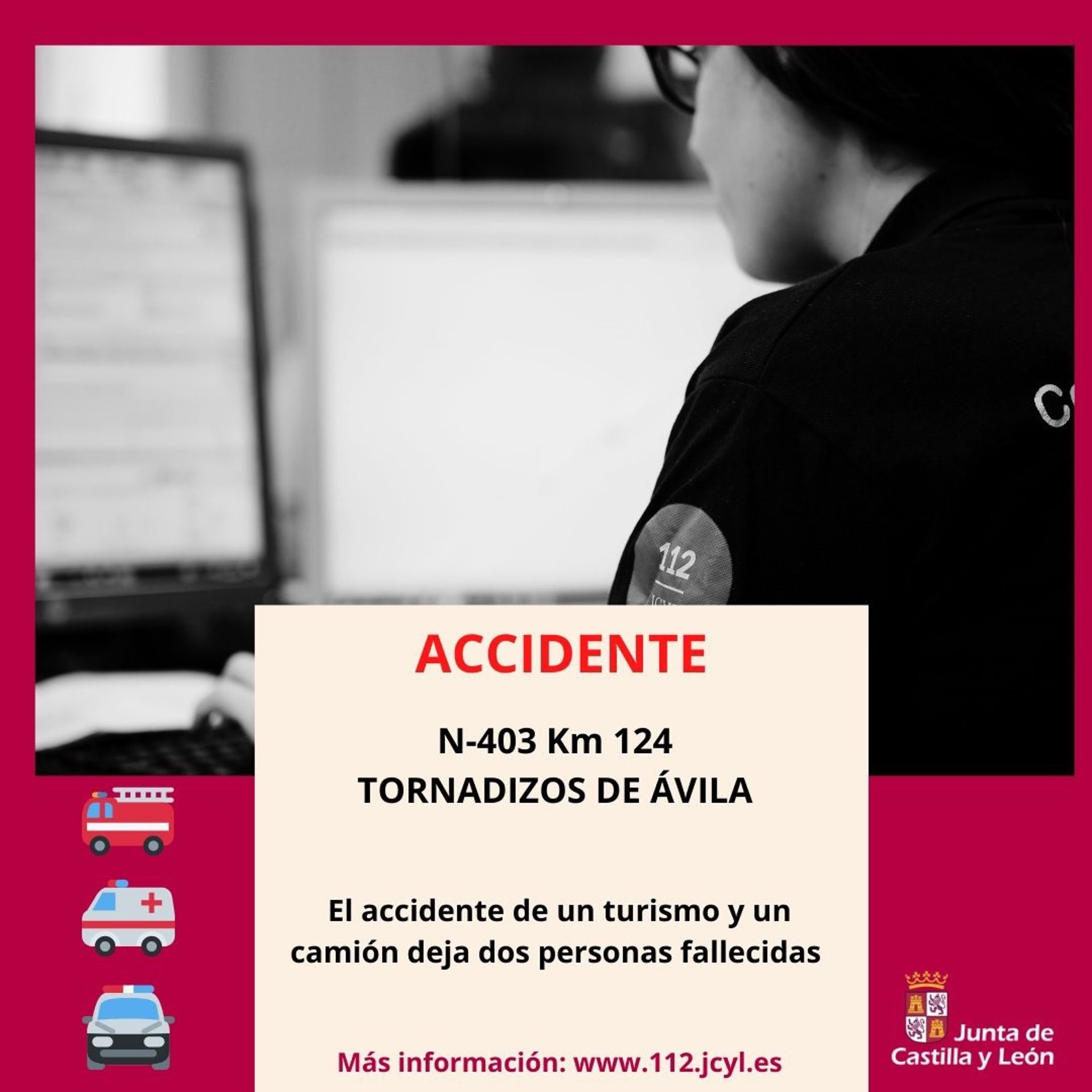 Los hechos han ocurrido en torno a las 10.43 horas cuando se informó al 112 de un accidente en el kilómetro 124 de la N-403 en Tornadizos donde, según los alertantes, habían chocado un camión y un turismo que había quedado "seriamente dañado" y en cuyo interior había dos personas heridas de gravedad.