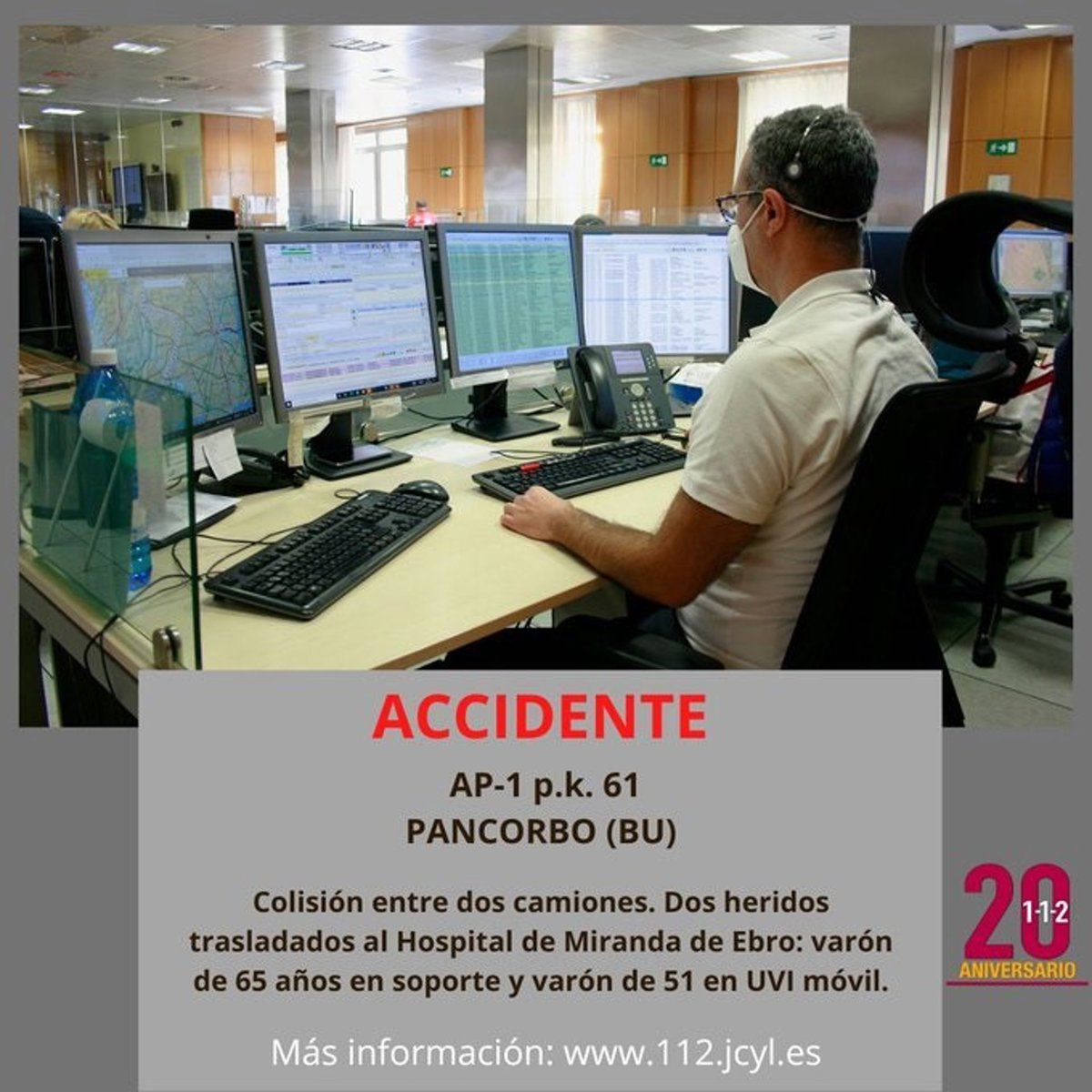 Dos varones de 51 y 65 años han resultado heridos en la mañana de este jueves, 4 de agosto, como consecuencia de un accidente de circulación registrado en la AP-1 a la altura del término burgalés de Pancorbo en el que se han visto implicados dos camiones, según los datos aportados por el Servicio de Emergencias de Castilla y León recogidos por Europa Press.