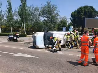 El accidente ha ocurrido en torno a las 12.30 horas de este pasado viernes en el cruce de la Avenida de Zamora con el Camino Viejo de Simancas de Valladolid a consecuencia del cual la furgoneta ha quedado volcada en la calzada, lo que impedía al conductor abandonar el vehículo por su propio pie.