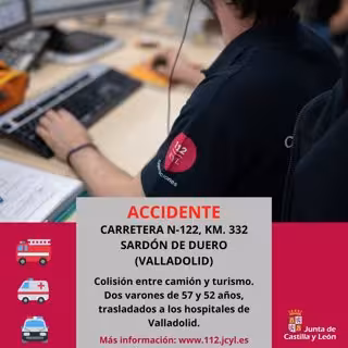 Dos varones de 57 y 52 años han resultado heridos tras colisionar un camión y un turismo en la N-122 a su paso por el término vallisoletano de Sardón de Duero, según ha informado el Servicio de Emergencias de Castilla y León 112.