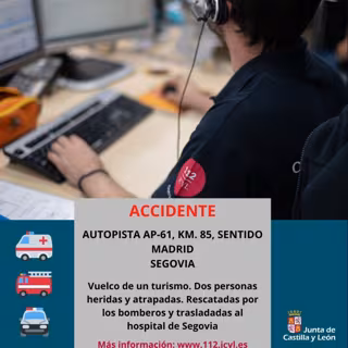 El 112 dio aviso de este accidente a la Guardia Civil (Tráfico) de Segovia, a los Bomberos de Segovia y al centro coordinador de urgencias (CCU) de Emergencias Sanitarias, Sacyl, desde el que envían una UVI móvil y una ambulancia de soporte vital básico.