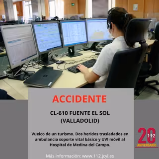 Este accidente ha ocurrido esta noche cuando a las 21.48 horas del martes, 21 de febrero, se informó al 112 del vuelco de un turismo en el kilómetro 64 de la CL-610, en Fuente el Sol, donde, según los alertantes, dos personas habían resultado heridas y se encontraban atrapadas en el interior del vehículo.
