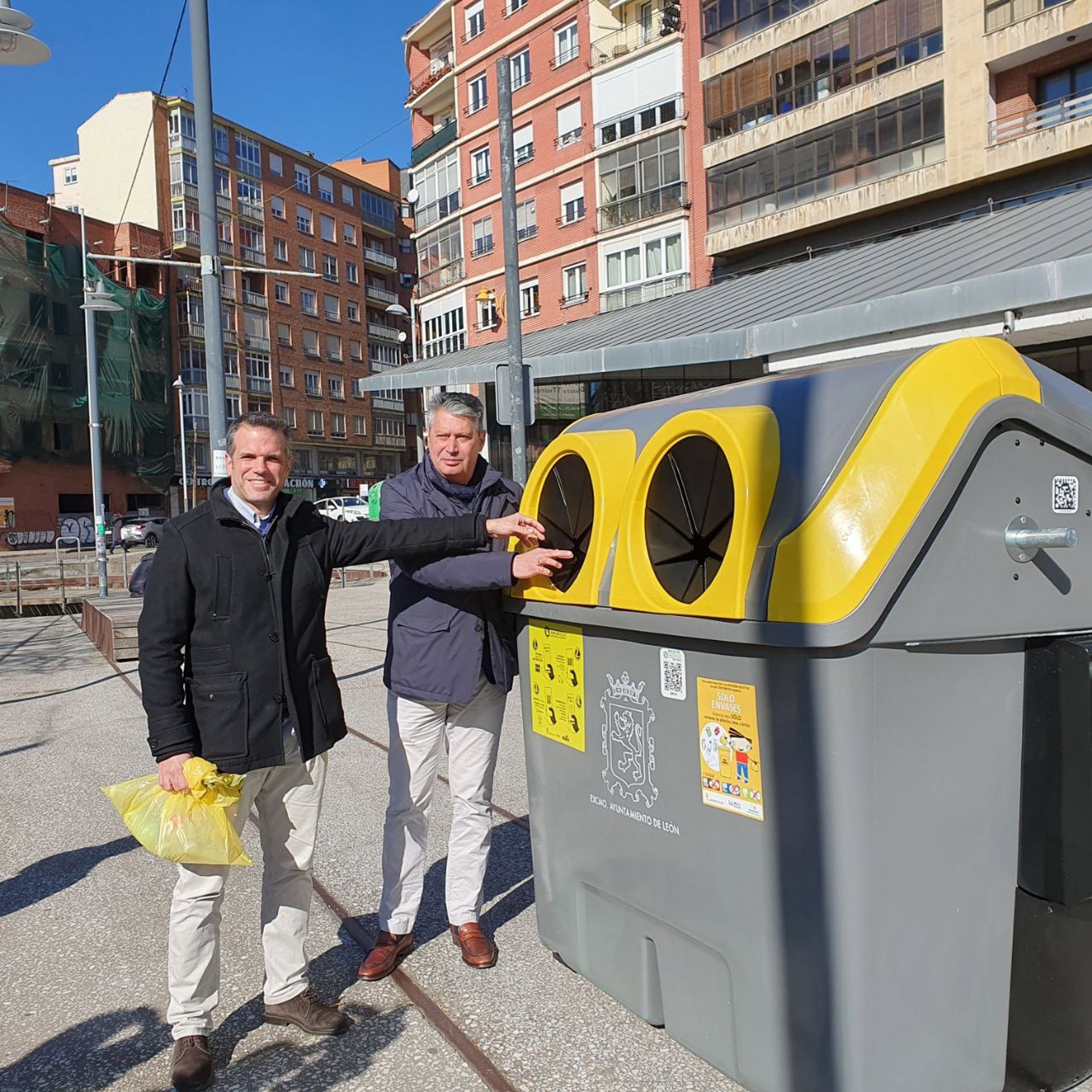 El concejal de Desarrollo Urbano, Luis García Copete, y el gerente de Ecoembes en Castilla y León, Jorge Serrano, en uno de los contenedores de la campaña 'Reciclos'. - AYUNT. DE LEÓN.