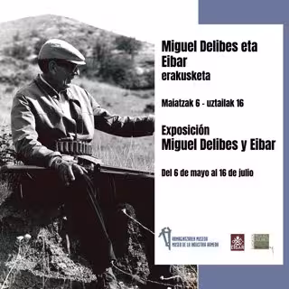 Cartel de la exposición en Éibar sobre Miguel Delibes y sus dos grandes pasiones. - MUSEO INDUSTRIA ARMERA ÉIBAR.