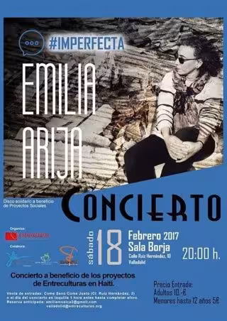 La cantante palentina Emilia Arija ofrecerá este sábado en la Sala Borja de Valladolid, a partir de las 20.00 horas, un concierto de su nuevo disco 'Imperfecta' cuyos beneficios irán destinados a apoyar proyectos educativos de Entreculturas en Haití.