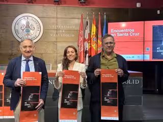 El rector de la UVa, Antonio Largo; la vicerrectora de Comunicación, Cultura y Deporte, Rebeca San José, y el coordinador del Foro de la Cultura, Óscar Blanco, presentan los VI Encuentros de Santa Cruz. - EUROPA PRESS